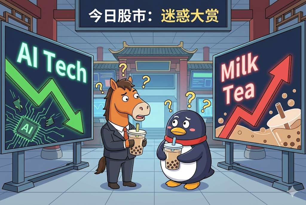 - 下午 3 点:股市传来黑色幽默。腾讯、阿里的股价微跌,反而是“奈雪的茶”和“蜜雪冰城”概念股涨停了。